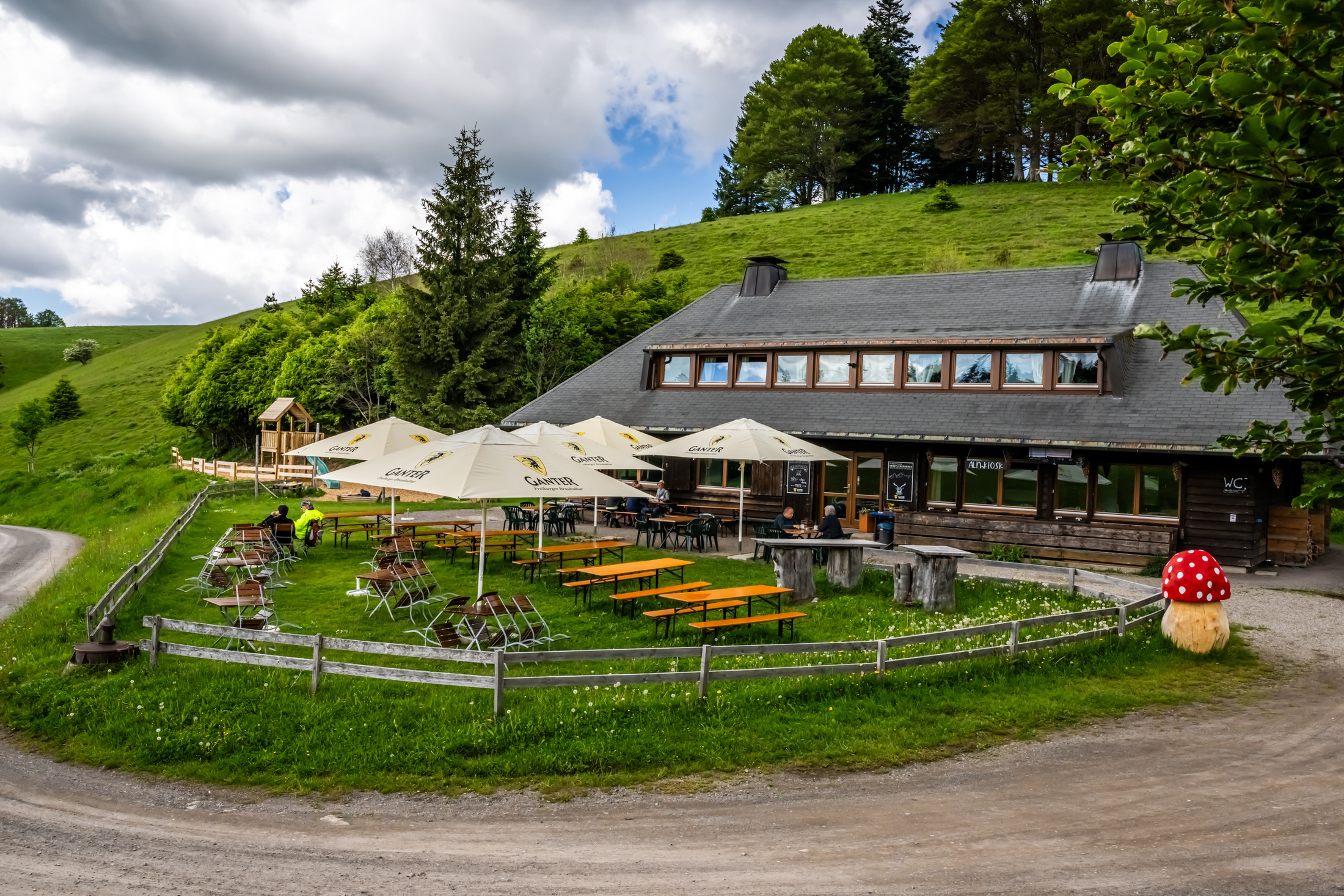 Dieses Foto zeigt das Almgasthaus Knöpflesbrunnen mit deren SonnenterasseDie dritte Etappe der Hüttentrekkingtour im Südschwarzwald führt uns von der Gisibodenalm zum Almgasthaus Knöpflesbrunnen. Heute erwarten uns gleich zwei Highlights: die Coasterbahn in Todtnau, die wir passieren und die wir – wenn wir wollen - ebenso nutzen können, um ins Tal zu fahren und uns die 400 absteigenden Höhenmeter zu ersparen, wie auch den bequemen Zweier-Sessellift. Außerdem wartet der Todtnauer Wasserfall, der höchste Naturwasserfall Deutschlands, bei Kilometer 8 auf uns. Über ihn führt die blackforestline, eine 120 Meter hohe und 450 Meter lange Hängebrücke, die den westlichen mit dem östlichen Brückenkopf miteinander verbindet. All diejenigen, die einen kurzen Abstecher machen und dabei rund zwei zusätzliche Kilometer sowie einige Höhenmeter in Kauf nehmen wollen, können dies also tun. Denn von hier ist es nicht mehr weit bis zum Almgasthaus Knöpflesbrunnen, unserem heutigen Übernachtungsziel.