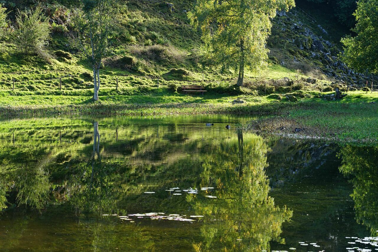 Und so gehen wir von der Dießlin-Hütte für wenige Meter entlang der L142 bis auf Höhe des Gasthaus Belchen-Multen. Gegenüber von diesem stoßen wir beim "Freilufthaus" auf den Wanderweg. Wir folgen der Beschilderung des Belchensteig und den angeschriebenen Zielen „Jägerstüble“, „Obere Stuhlsebene“, „Belchenhaus“ und „Belchen“ (gelbe Raute). Schon bald kommen wir an ein Wegkreuz, an dem drei weitere Wege in unterschiedliche Richtungen abgehen. Wir folgen dem rechten der drei Wege bergwärts in Richtung Abzweig Stuhlsebene, der sich 500 Meter weiter befindet. An diesem entdecken wir das Haus Bergfried, das Belchenhotel Jägerstüble sowie die Belchen Seilbahn. Wir halten uns an dieser Stelle links, schließlich wollen wir das Hochplateau Obere Stuhlsebene erkunden. 600 Meter weiter erreichen wir dieses. Halbrechts zeigt nun der Wegweiser mit der gelben Raute in Richtung „Untere Stuhlsebene“, „Sägeneck“, „Schönenberg“ und „Böllen“. Wir folgen dem Wiesenpfad über das Hochplateau, das durch herrliche Panoramasichten beeindruckt. Vorbei an alten Buchenbeständen geht es nun auf dem Weidbuchenpfad entlang hinunter zur Unteren Stuhlsebene (Km 4,3) und anschließend weiter zum Sägeneck (Km 4,7). Immer weiter bergabwärts führt uns von hier die gelbe Raute anschließend nach Schönenberg, einer eigenständigen Gemeinde oberhalb von Schönau, deren Ortskern auf 680 Meter liegt. Wir durchqueren das idyllische Schwarzwalddorf, vorbei an der Kapelle und dem Rathaus und halten uns in Richtung „Letzberghalde“, „Aitern“, „Holzinshaus“ und „Mittelbühl“. Kurz nach der Letzberghalde, an der wir dem Wanderweg und der gelben Raute geradeaus folgen, haben wir am Hassler Felsen zu unserer rechten einen wunderbaren Ausblick auf das kleine Schwarzwaldstädtchen Schönau, das die Geburtsstadt von Weltmeistertrainer Jochim Löw ist. Von hier wandern wir auf dem Philosophenweg für rund 600 Metern. Anschließend halten wir uns gleich zwei Mal rechts, um nach weiteren 400 Metern nach links zu gehen. Hier entdecken wir den Letzbergweiher, der sich traumhaft in die idyllische Berglandschaft einfügt und ein wahres Kleinod für die hiesige Tier- und Pflanzenwelt darstellt. Er ist ein beliebtes Ausflugsziel oberhalb von Schönau, lädt er aufgrund der Ruhe und Stille mit seinen Sitzgelegenheiten und einer Sonnenliege zum Verweilen ein. Doch wir müssen nach einer kurzen Pause weiter, schließlich müssen wir noch nach Bernau und zurück zum Ausgangspunkt der Tour, um hier unser Auto abzuholen.