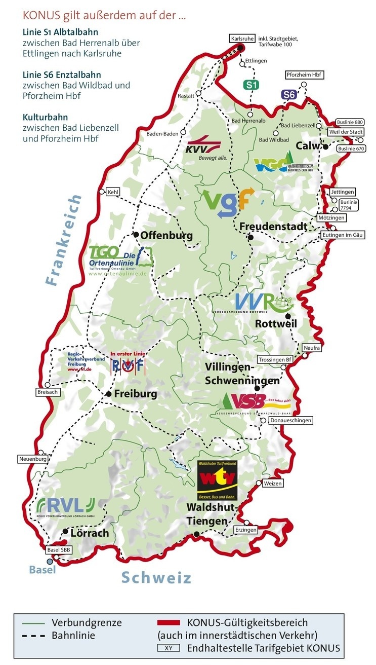 KONUS steht für KOstenlose NUtzung des ÖPNV für Schwarzwaldurlauber. In über 145 Ferienorten mit rund 11.000 Gastgebern ist die Gästekarte mit dem KONUS-Symbol versehen: Damit ist der Freifahrtschein (2. Klasse und nur für Personen) in allen Verkehrsverbünden der Ferienregion Schwarzwald aktiviert. Wie lange? Bis zu Ihrem Abreisetag! Umweltfreundlich von Pforzheim bis Basel, von Karlsruhe bis Waldshut, von Calw, Freudenstadt oder Villingen-Schwenningen bis an die deutsch-französische Grenze. Kreuz und quer, auf und ab, so oft sie mögen.