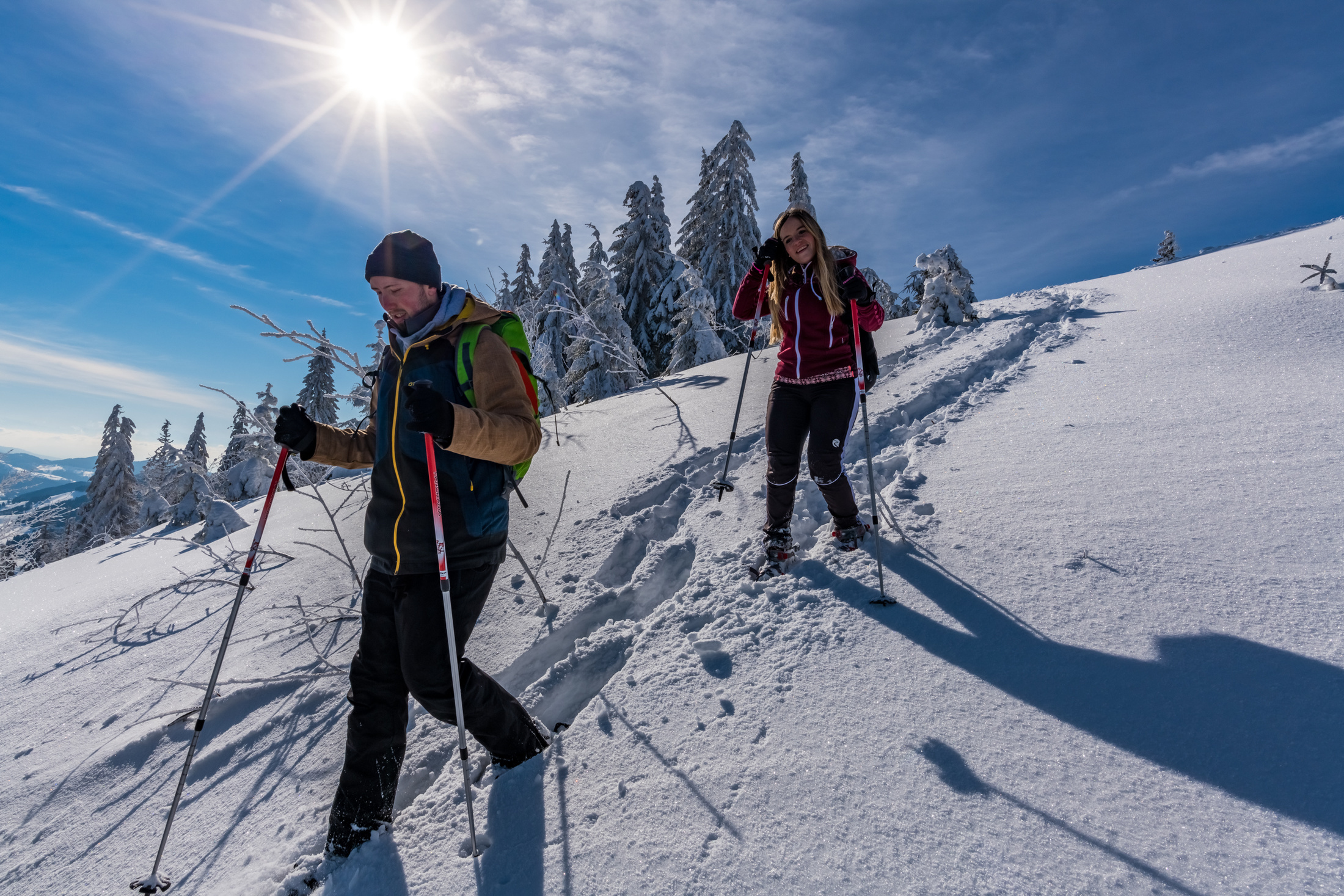 Fernab des Trubels und der großen Menschenmassen warten rund um den Belchen nicht nur drei Skigebiete mit variantenreichen Abfahrten von leicht bis schwer auf Winterurlauber, sondern auch mehr als 50 Kilometer bestens präparierter Loipen, ein Winterwanderwegenetz sowie drei Schneeschuhtrails. Was gibt es denn schöneres als in einer scheinbar (fast) unberührten Winterlandschaft mit Schneeschuhen durch den Tiefschnee zu stapfen und Zeit mit der Familie zu verbringen, während die Kleinen von den umliegenden Berghängen hinunterrodeln?